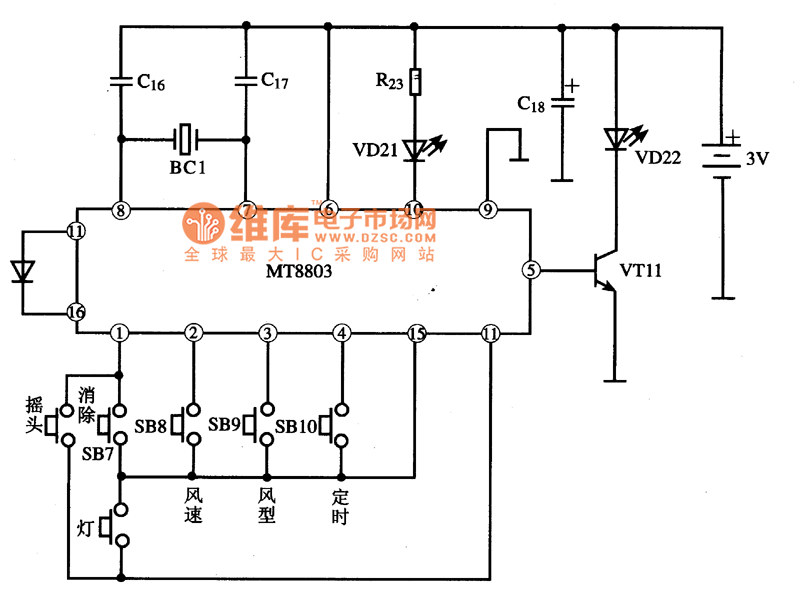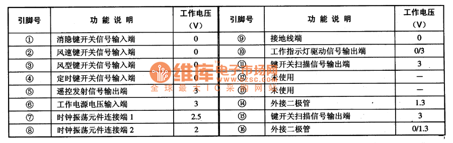 MT8803 is an infrared remote controller integrated circuit, which often forms the fan remote control system with the remote signal receiver circuit MR8181 and the fan single chip integrated circuit MH8822, such as the Great Wall fan and the like. MT8803 is in 16-pin dual line package, whose typical application circuit is shown in the figure, and its pin functions and data are listed in the figure.
