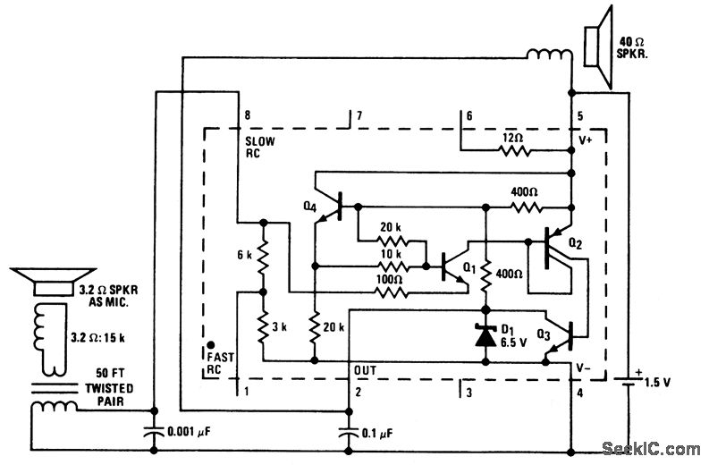 This little LM3909 audio amplifier can be operated as a one-way intercom or for listening in on various situations. Operating current is only 12 to 15 mA. The circuit can hear fairly faint sounds, and someone speaking directly into the microphone generates a full 1.4-V peak-to-peak at the speaker.