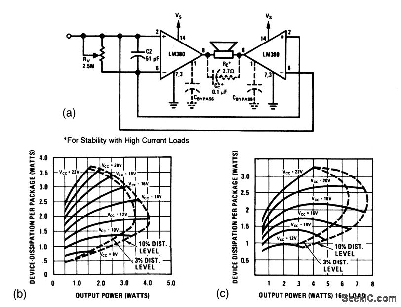 This circuit shows two LM380 ICs connected to double the audiooutput power of a single LM380.The Circuit provides twice the voltage swing across the load for a given supply, increasing the power capability by a factor of four over the single amplifier. However, in most cases, the package dissipation is the first parameter that limits power to the load. In such cases, the power capability of the bridge circuit is only twice that of the single IC. Figures 1-37B and 1-37C show output power versus device-package dissipation for both 8- and 16-Ω loads in the bridge configuration. Notice that the 3% and 10% harmonic distortion contours double back (because of the thermal limiting of the LM380). Different amounts of heatsinking will change the point at which the distortion contours bend.
