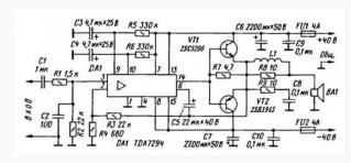Monoblock Car Amplifier circuit TDA7294 is based on an article “Improving the power amplifier IC TDA7294″ Journal of the radio, № 11 2005. This mono car amplifier has a sufficiently high reliability, high capacity, high-quality bass. Monoblock Car Amplifier circuit is shown above. The difference from the original circuit only in the output transistor using a better replacement.All non-electrolytic capacitors, except for C2, film, 1 uF input capacitance can be replaced 2.2uF. Power of resistors are selected using a 0.25W, although 0.125W is still insufficient. Output transistors of Monoblock Car Amplifier mounted bent and pressed so that their position parallel to the board, to remove heat, a heatsink for transistor 2SC5200 and 2SA1943 and is required. Do not forget to provide insulation and thermal paste between the heatsink and transistors. Inductor L1 frameless, coiled wire diameter of 1 mm in two layers and contains 25 turns, the inner diameter of 5 mm.