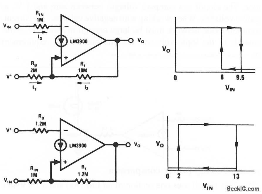 This circuit uses one section of an LM3900 connected to form a Schmitt trigger. Both inverting and noninverting versions are shown. By adjusting the values of RB, RF, and /RIN, the switching values of VIN can be set to any desired levels. National Semiconductor Linear Applications Handbook 1991 p 244