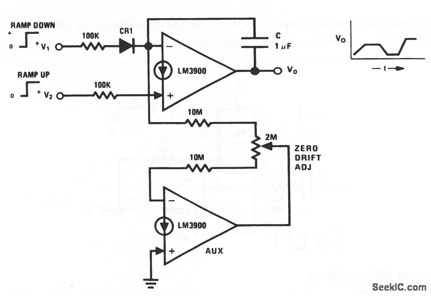This circuit uses two sections of an LM3900 to form a low-drift ramp-and-hold circuit with a zero-drift adjustment. If both inputs are at zero volts, the circuit is in hold (after proper zero-drift adjustment). Raising either input causes the dc output to ramp up or down, depending on which input goes positive. The ramp slope is a function of the input-voltage magnitude. Additional inputs can be placed in parallel to increase the input-control variables. National Semiconductor, Linear Applications Handbook 1991 p 249