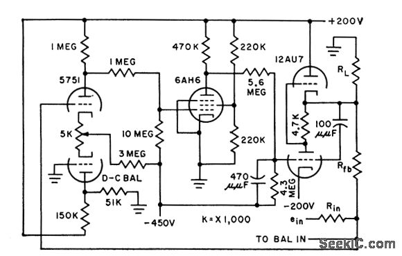Ideal for control systems and analog computers because of broad passband and large control-system response characteristic. Open-loop gain above 15,000. Output swings 100V into 20,000-ohm load. Can be used from d-c to 20kc at unity dosed-loop gain.-L. S. Klivans, D-C Amplifiers for Control Systems, Electronics, 31:47, p 96-100.