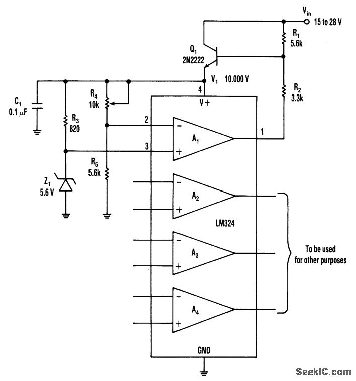 This op amp offers a straightforward method of developing a single-polarity stable voltage source (see the ftgure). Transistor Q1 gets a base drive through resistor R1, and conducts to develop a voltage(V1) across the IC's supply pins. Amp A1, R2, and Q1 form a positive-feedback closed loop, along with R3 and the zener diode. A1, R2, and Q1 also form a negative-feedback closed loop with R4 and R5.The effect of positive feedback is predominant as the noninverting input receives V1while the inverting input receives only: This happens until the zener comes into play. When the voltage at the inverting input exceeds the voltage at the noninverting input, A1's output takes away Q1's base current through R2, which reduces V1.Hence, an equilibrium condition is reached. Now:This circuit can source more than 30 mA.