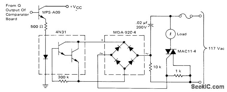 Circuit triggers 10-A triac when Q output of comparator-driven flip-flop is logic 1. LED in optoisolator is then energized, activating phototransistor pair for driving gate circuit of triac through diode bridge. Trigger voltage of triac is positive for first quadrant and negative for third quadrant, to give maximum sensitivity of triac control.-D. Aldridge and A. Mouton, Industrial Clock/Timor Featuring Back-Up Power Supply Operation,” Motorola, Phoenix, AZ, 1974, AN-718A, p 7.