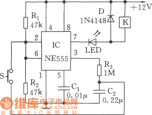 As shown in the figure, 555 is the core of the circuit. Pay attention that R1 = R2 = 47 k Ω and the trigger end feet 2 (set ) connected to 555 and the threshold level end feet 6 (reset); Resistance R3, capacitance C2 for charge and discharge are connected to the output end feet3, and are linked with feet 2 and 6 through the switch. When S disconnects, feet 2, 6 are both 1/2 VDD = 6 V, therefore, the level of feet is random, sometimes it is high, and sometimes it is low. If feet 3 is a high level (about VDD-1. 5 V = 10.5 V), pressing S will add the charge voltage on C2 to feet 6 , to make it higher than trigger level 2/3 VDD, then 555 will be reset, and feet3 will become a low level.