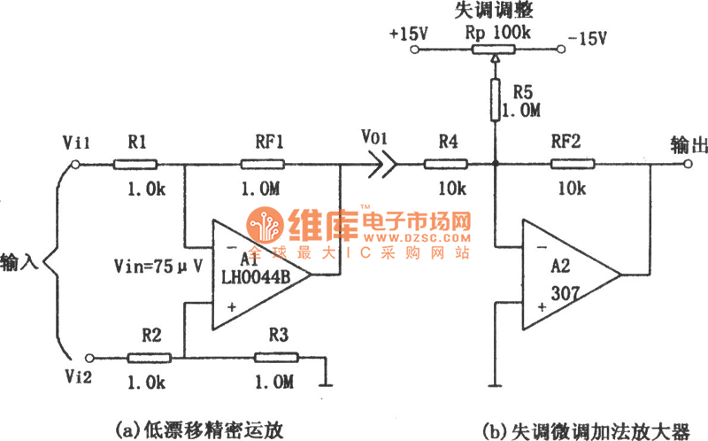 Precision op amp without changing the drift of the offset nulling circuit is shown in Figure (a) and (b). Figure (a) is low-drift precision op amp. Figure (b) is the zero offset adder circuit. According to the figure (b), when R4 = RF2, Av2 = 1, thatis the follower. Figure (a), if R1 = R2 = 1kΩ, R3 = RF1 = 1MΩ, then Vol = R3 / (R2 + R3) · (1 + RFl / Rl) · Vi2-RFl/Rl · Vil. Al's voltage gain is obviously great, so its output voltage will contain the A1 offset voltage.