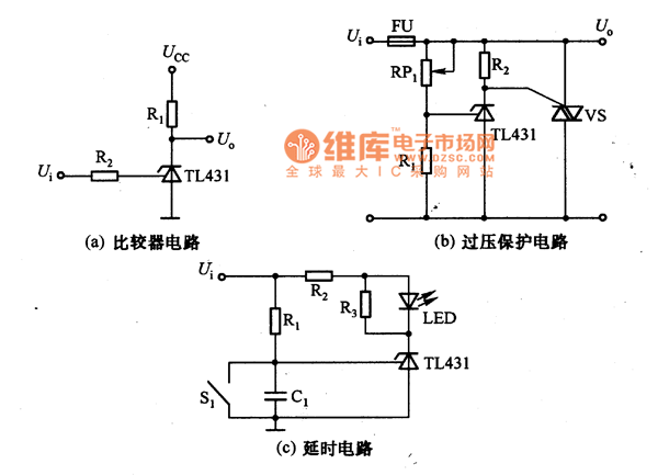 The picture a,b,c are comparator circuits of TL431.The picture (a) is comparator circuit of TL431.When input voltag9be Ui≥2.5V,the output voltage U。=2V;Ui<2.5V,the output U。=Ucc.