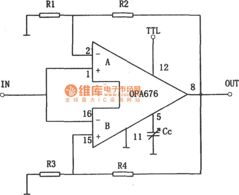 The picture shows the gain programmable amplification circuit. This circuit is mainly made up of OPA676 integrated chip. And the OPA676's internal part has two channels amplification circuit which is marked as A channel and B channel separately (see the A and B in the picture). The two channels' conducting mode or not conducting mode are controlled by the pin 12's voltage level (which is called TTL port). If the TTL port's voltage is high level, the A channel (the higher part of the circuit) would work and the B channel (the lower part of the circuit ) would be not conducted. Otherwise when the TTL port is in low voltage level, the A channel would be not conducted and the B channel would work. The A channel's voltage magnification is AVA=1+R4/R3, and the B channel's voltage magnification is AVB=1+R4/R3. So it could only select different R1, R2 or R3, R4, the A and B channels would have different gain. By controlling the A and B channels selection port TTL's voltage level (pin 12), it could be easy to achieve the gain programmable control.