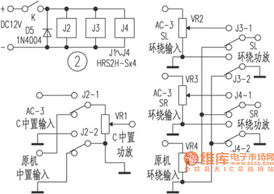 1.In the original device the middle power amplifier and the surrounding power amplifier have the same principle which are installed on a same circuit board (which is shown in the picture). The difference is the surrounding power amplifier's negative feed-back resistance R60 is 150kΩ. So it should also change the feed-back resistance R503 to 150kΩ in the middle power amplifier to make the dual sound-channels' gain be same. The original device's middle power amplifier would be used as another sound-channel surrounding power amplifier. And also it should make the original device's four surrounding wiring terminals's series terminals be disconnected and then connect them to the dual channel surrounding power amplifier's output ports.
