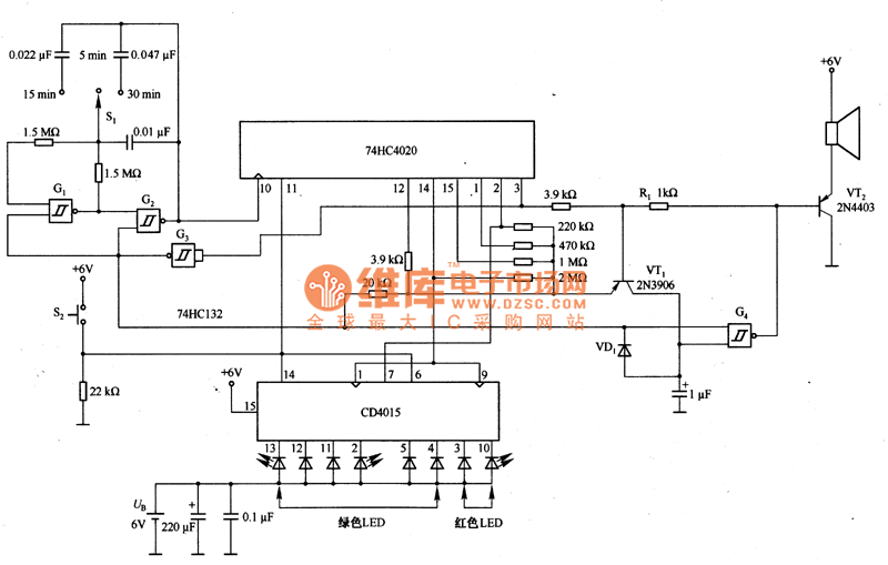 Picutre 1 is time to acousto-optic reminding circuit.In the circuit,74 HC4020 is 14 counter; CD4015 is eight shift register and S2 is reduction switch.When it instantly closes, 74 HC4020 and CD4O15 also reset and the G1 and C2 may constitute a time interval oscillator. S1 is selected switch and it can choose 5 min, 15 min and 30 min.The cirucit gives sound and light alarm signal when time is up.