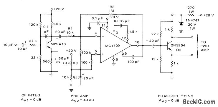 Uses Motorola MPSA13 operational integrator to provide 90° phase shift for MC1709 inverting opamp, with single-ended output complemented by phase splitting amplifier to provide push-pull drive for power amplifier of 115-V 60-Hz senvomotor, Voltage gain is about 40 dB.-A Pshaenich, Servo Motor Drive Amplifiers, Motorola, Phoenix,AZ,1972,AN-590.
