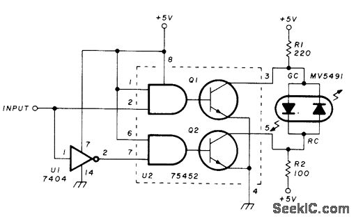 High or positive input to circuit gives green indication in Monsanto MV5491 dual red/green LED, and low input gives red. Circuit uses single SN75452 IC INPUT driver and one section of SN7404 hex nverter.-K. Powell, Novel Indicator Circuit,Ham Radio, April 1977, p 60-63.