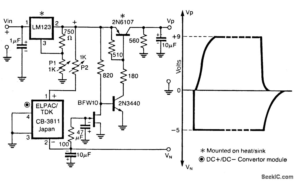 The dual regtilator circuit operates from a positive supply, which when switched ON powers the gate first, and when switched OFF shuts off the drain first as shown in the figure. This circuit incorporates the LM123, a three terminal positive regulator and a dc + to dc - converter, the outputs of which power the drains and gates of the power GaAsFETs in a power amplifier relay. The output of the three terminal regulator drives a dc + to dc - converter whose output biases an N-channel JFET suitably so as to pull the base of the series pass transistor 2N6107 to a level to turn it on. The circuit will turn off the drain supply whenever the negative potential on the Gate fails.