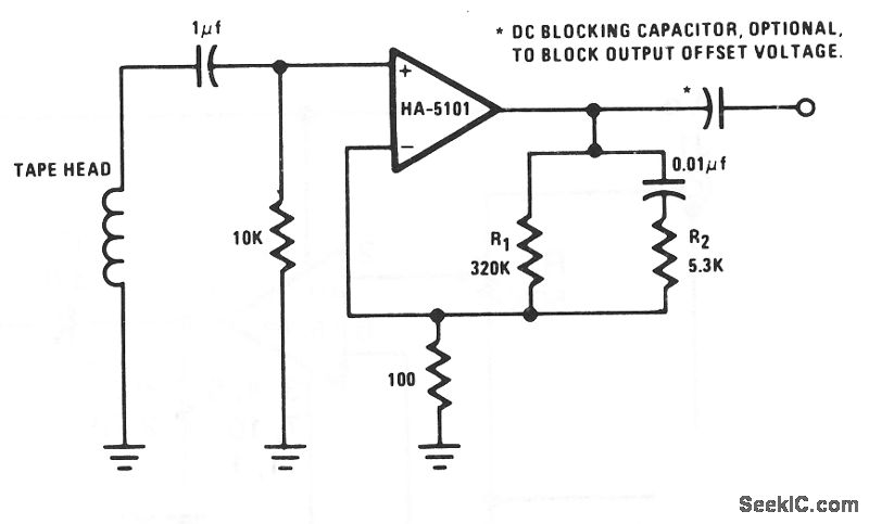 The preamplifier is configured to provide low-frequency boost to 50 Hz, flat response to 3 kHz, and high-frequency attenuation above 3 kHz. Compensation for variations in tape and tape head performance can be achieved by trimming R1 and R2.