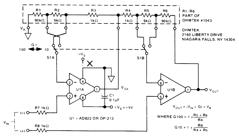 This is a two-op-amp programmable-gain instrumentation amplifier for single-supply applications. U1A and U1B are Analog Devices AD822 or OP-213 ICs.