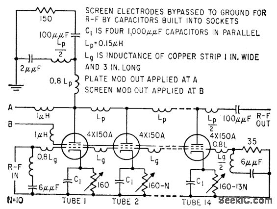 Gives 20% bandwidth centered on 200 Mc. Used as output stage of moderate-power radar, final drive of high-power drive, and for high-level pulse amplification.-S. K. Meads, How to Design Pulsed Distributed Amplifiers, Electronics, 32:12, p 56-58.