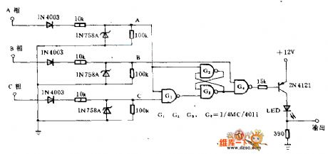 If the motor of the drive pump, compressor or transmission belt reverse run, the equipment will be damaged. This circuit can find out whether the motor phase sequence is error, and protect the motor damaged by the rapid-heating. When the phase sequence is correct, the LED lights. When the phase sequence is not correct, the output power goes low, the LED not lights. The diode and zener convert the sine wave into rectangular logic level pulse. when the phase sequence is correct, G4 outputs a string of rectangular pulse, the pulse width is about 2.5 ns. When the phase sequence is not correct, the output power is zero. The output pulse edge's zero-crossing and B phase's zero-crossing are synchronous, so the output pulse can be used to trig the SCR and drive relay coil which are connected with the Phase B's two ends. This kind of SCR can supply power to relay only when the phase sequence is correct.