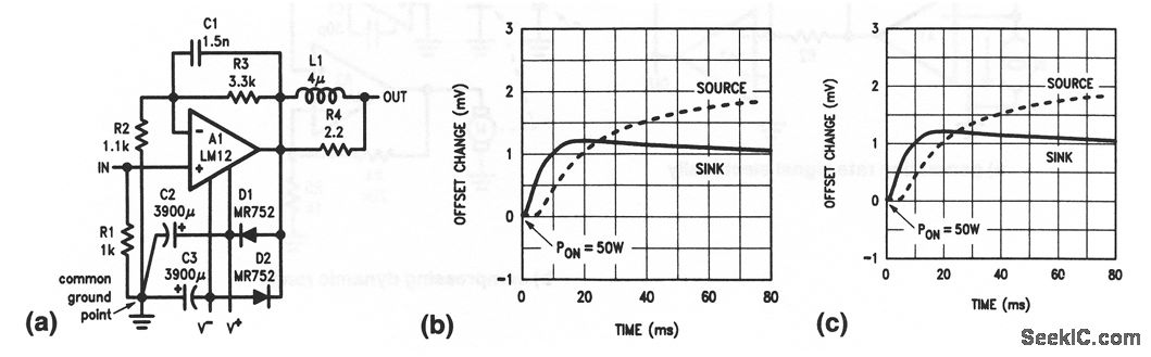 This amplifier uses a single LM12 (Fig. 10-46) with dual supplies. Figure 10-55B shows the total harmonic distortion or THD (Fig. 1-E) for both low-and high-level outputs. Typical intermodulation distortion (Fig. 1-F) is 0.015% with ±10 V into a 4-Ω load, using the standard 60-Hz/7-kHz 4:1 test conditions. Figure 10-55C shows the offset-voltage change after the application of a load that dissipates 50 W in each output transistor.
