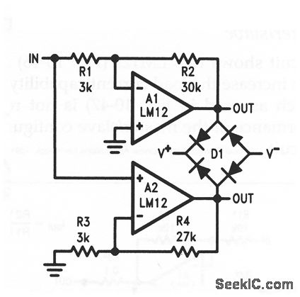 The differential output of the LM12 (Fig. 10-46) amplifier almost doubles the voltage swing delivered to the load. The diodes clamp the outputs to the supplies.