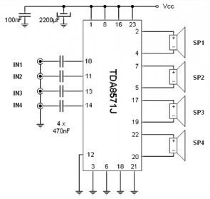 With theintegratedaudioTDA8571Jdesignedforautomotive applications,this 40w amplifier circuit can expandthe soundof the car radioorconnecta portableMP3playerin it.Internally, thechiphas eightoperationalamplifierseton the bridge, allowingeachspeaker terminalbeing energized.Dontconnect thenegative terminal ofthe mass ofthe speaker,becausetheywillproducea short circuiton theoutput.