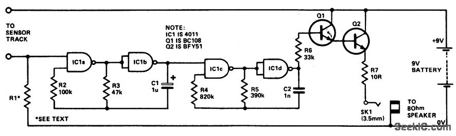 The circuit uses four NAND gates of a 4011 package. In eachoscillator, while one gate is configured as a straightforward inverter, the other has one input that can act as a control input. Oscillator action is inhibited if this input is held low. The first oscillator (IC1a and IC1b) has this input tied low via a high value resistor (R1) that acts as a sensitivity control. Thus this oscillator will be disabled until the control input is taken high. Any moisture bridging the sensor track will so enable the output which is a square wave at about 10 Hz. This in turn will gate on and off the 500 Hz oscillator formed by IC1c and IC1d. This latter oscillator drives the loudspeaker via R6, the Darlington pair formed by Q1 and Q2, and resistor R7.