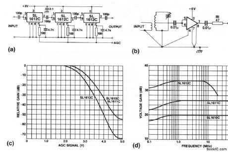 The SL1610, SL1611, and SL1612 shown in these circuits are RF voltage amplifiers with AGC provisions. The voltage gains are 10, 20, and 50, respectively, and the upper frequency response varies from 15 to 120 MHz, according to the type. Figure 2-8A shows three SL1612Cs connected as an IF amplifier(with AGC). Figure 2-8B shows any of the three ICs connected as an RF amplifier (without AGC). Figures 2-8C and 2-8D show the AGC characteristics and gain versus frequency, respectively, for the three ICs. Electrical characteristics are shown in Fig. 2-8E.