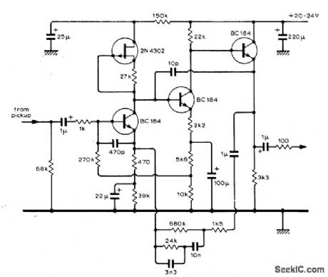 Low-noise circuit (below -70 dB referred to 5-mV input from pickup) has high overload capability and low distortion (below 0.05% intermodulation at 2 VRMS output}. Arrangement of first stage gives improved transient reponse over usual feedback pair. Second stage provides gain of 10.-S. F. Bywaters, RIAA-Equalized Pre-Amplifier, Wireless World, Dec. 1974, p 503.