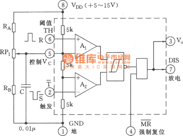 As shown in the figure is a circuit in which 555 works as a RS trigger. If the control voltage on the controlling end feet 5 is removed, there will be no need to connect any external component with 555, but add negative and positive control pulse on feet 2 and 6 respectively to constitute a RS trigger circuit. End R is the reset control input end feet 6, which is also called threshold end (TH);end S is the set control input feet 2, which is also called set trigger end T. The output end (feet 3) within the chip is actually push-pull output, whose low level output is only about 0.3 V and whose high level is close to VDD, so it has a very strong load capacity