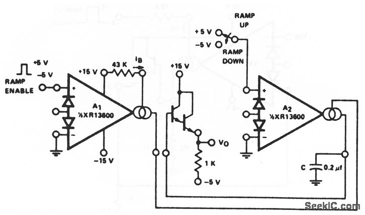 This circuit uses both sections of an XR-13600(Fig.11-1B). The circuit Sources IB into capacitor C whenever the input to A1 is made high,giving a ramp rate of about 1V/ms for the values shown.EXAR corporation Databook 1990 p 5-257