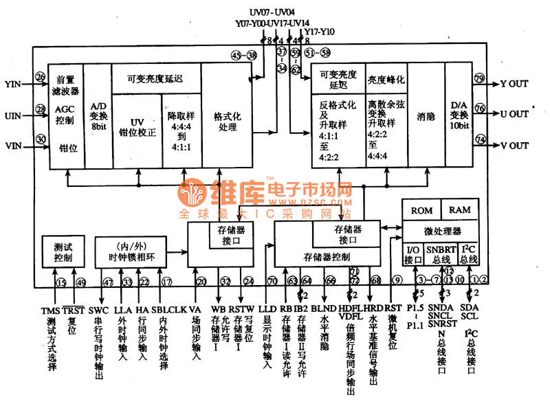 SAA4977 is a D/A converter and control integrated circuit, which is widely used in local and imported scanning large screens TV and computer screens.1.function featuresSAA4977 includes the D/A signal convert control circuit, microcomputer process circuit, storage circuit, frequency doubler signal process circuit, Y, U and V digital signal process circuit, analog Y, U and V signal process circuit and other additional circuit. The internal circuit is shown in the figure.