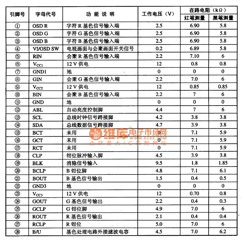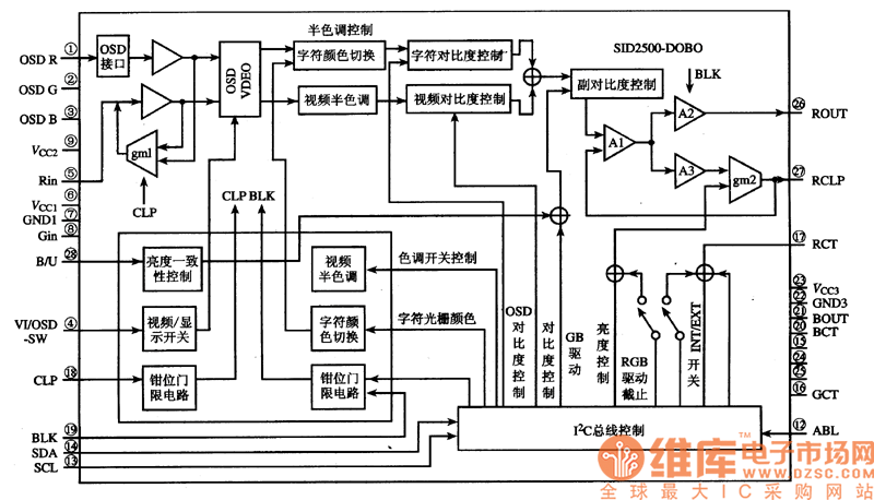 1. Function featuresSD250O-DOBO includes the lzC general control circuit, letter RGB base color signal process circuit, contrast ratio control circuit, OSD connector circuit, brightness conformity control circuit, clamp door limiting circuit, video/display switch circuit, letter color shift circuit, semi-hue control circuit, video half-hue circuit, brightness control circuit and other additional function circuits, whose internal circuit is in the figure.2.pin functions and dataSD250O-DOBO is in 28-pin dual in-line package.