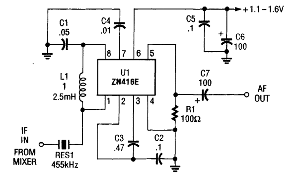 The ZN416E can be configured as a simple 455-kHz IF amplifier. In this case, the drcuit's center frequency and bandwidth are set by RES1 (a Murata CSB455E ceramic resonator).