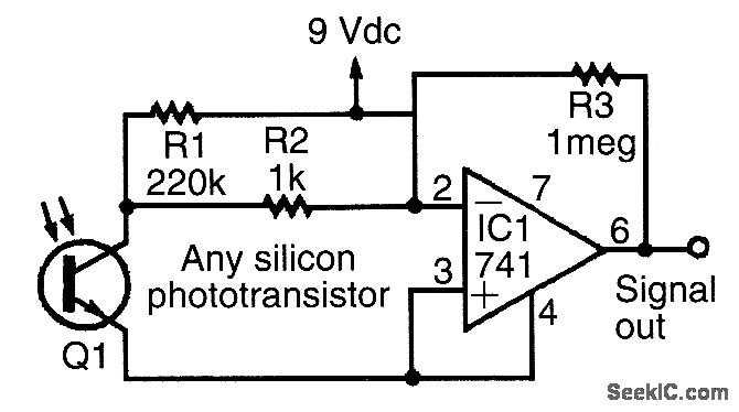 This simple amplifier will work well with just about any phototransistor. The 741, although designed to operate with a split supply, will work with a single-sided supply as well.