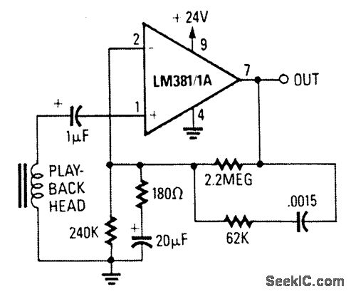 This circuit uses an LM381/1A as a tape pre-amp. The feedback network includes NAB Equali-zation.