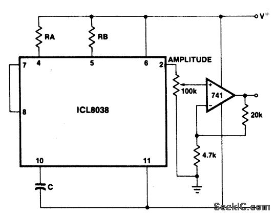 The sine wave output has a relatively high output impedance (1K typ). The circuit provides buffering, gain, and amplitude adjust ment. A simple op amp follower could also be used.