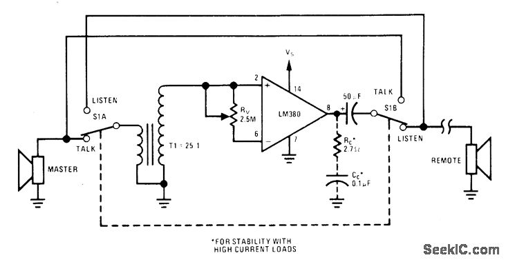 When switch S1 is in talk position as shown, loudspeaker of master station acts as microphone, driving opamp through step-up transformer T1. Switch at remote station must then be in listen position. Supply voltage range is 8-20 V.- Audio Handbook, National Semiconductor, Santa Clara, CA, 1977, p 4-21-4-28.