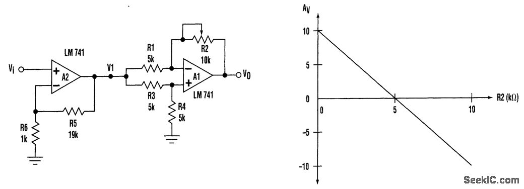 It is handy to have a gain block with a gain that can be varied smoothly from positive to negative with a single potentiometer. The circuit shown accomplishes this function with R2. Op amp A1 is configured with both inputs tied together. Op amp A2 functions as a buffer. WithR1=R3=R4=R=5KΩ,the gain of the differential amplifier is given by AV1=(V0/V1)=1/2(1-R2/R). With a buffer amplifier gain of 20, the overall gain of the amplifier is given by AV=(V0/V1)=10(1-R2/R). By using a 10-turn potentiometer, the gain can be varied from positive to negative.