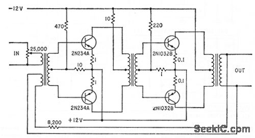Four-transistor class AB audio amplifier delivers 200 w to four loudspeakers. Standby power drain is 12 w.Input is obtained from warble generator.-W.F. Ferguson, High-Powered Audio Alarm Systems, Electronics, 33:16, p 70-72.