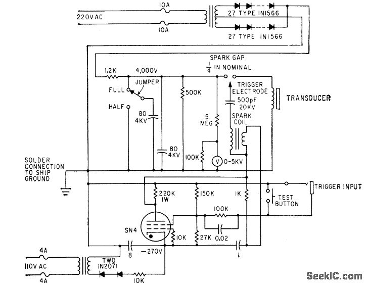 Strobotron tube circuit energizes spark coil, ionizing spark gap and discharging bank of 4,000-v capacitors through underwater transducer coil, causing adjacent aluminum plate to produce high-power sound pulse that penetrates sediment layers and bedrock for oceanographic research.-New Sonar Thumper Charts Ocean Subbottom, Electronics, 34:5, p 56:57.