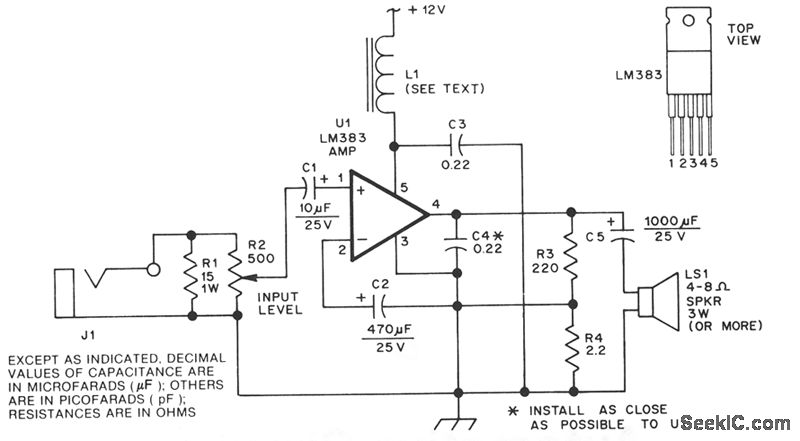 The LM383 is an audio-power amplifier that is capable of producing up to 8W of audio output. R1 is essentially a load resistor for the hand-held transceiver's audio output. R2 can be composed of two fixed resistors in a 10:1 divider arrangement, but using a potentiometer makes it easy to set the amplifier's maximum gain. When powered from a vehicle's electrical system, the amplifier's +12V power source requires filter L1 to eimtnate alternator whine. The LM383 can be mounted directly on the heatsink because the mounting tab is at ground potential.