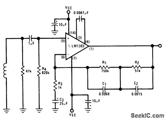 Low-noise circuit using LM1303 provides RIAA response and operates over supply voltage range of ±4.5 to ±15 V. 0-dB reference gain (1 kHz) is about 34 dB. Input is from magnetic cartridge.- Audio Handbook, National Semiconductor, Santa Clara, CA, 1977, p 2-25-2-31.