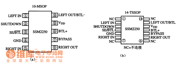 The internal circuit of SSM22502.pin functionsSSM2250 has two kinds of packages: 10-pin MSOP and TSSOP, whose pin sequence is shown in the figure, and the two packages with their relationship and the pin functions are listed in the table.