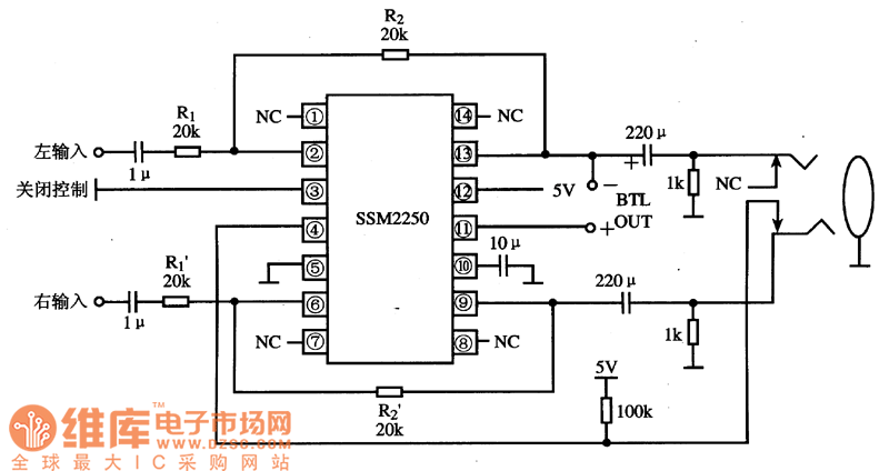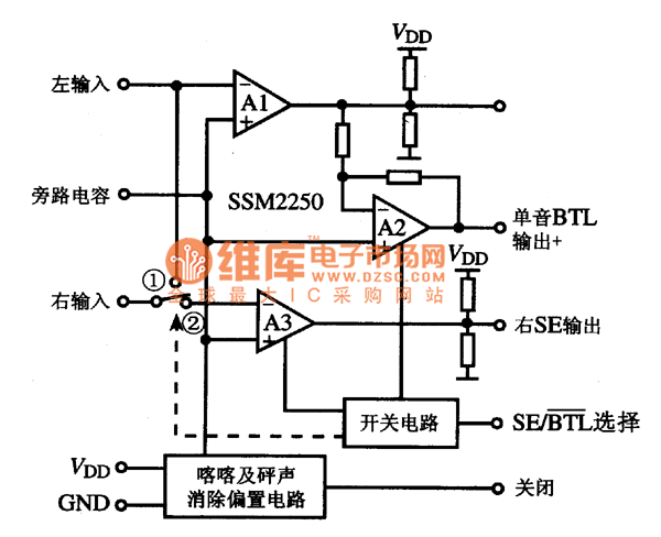 1.function featuresSSM2250 includes 3 full amplitude(output amplitude value is close to that of power supply) computing amplifiers, kluck and Ping sound removing bias circuit and switch control circuit, etc. Its internal circuit is shown in the figure.