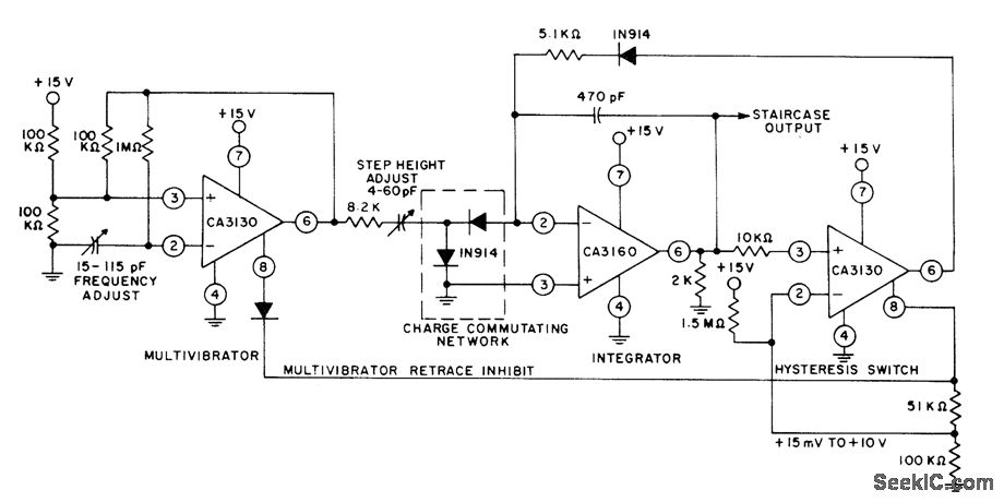 Two CA3130 bipolar MOS opamps serve as multivibrator and hysteresis switch, while CA3160 is connected to generate linear staircase wave-form.- Circuit Ideas for RCA Linear ICs, RCA Solid State Division, Somerville, NJ, 1977, p 6.
