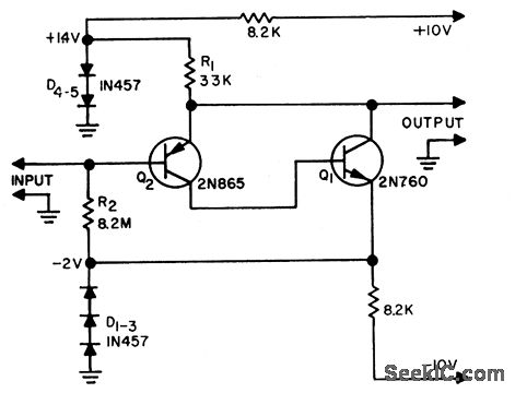 Serves as wideband input stage for chopper-stabilized amplifier that resolves 10 microvolts. Bandwidth is 100kc, equivalent input noise is less than 10 microvolts rms, and input current is only 8 nanoamperes. -Starved DC Amplifier Has Low Noise, High Z, Electronic Circuit Design Handbook, Mactier Pub. Corp., N.Y., 1965, p 108.