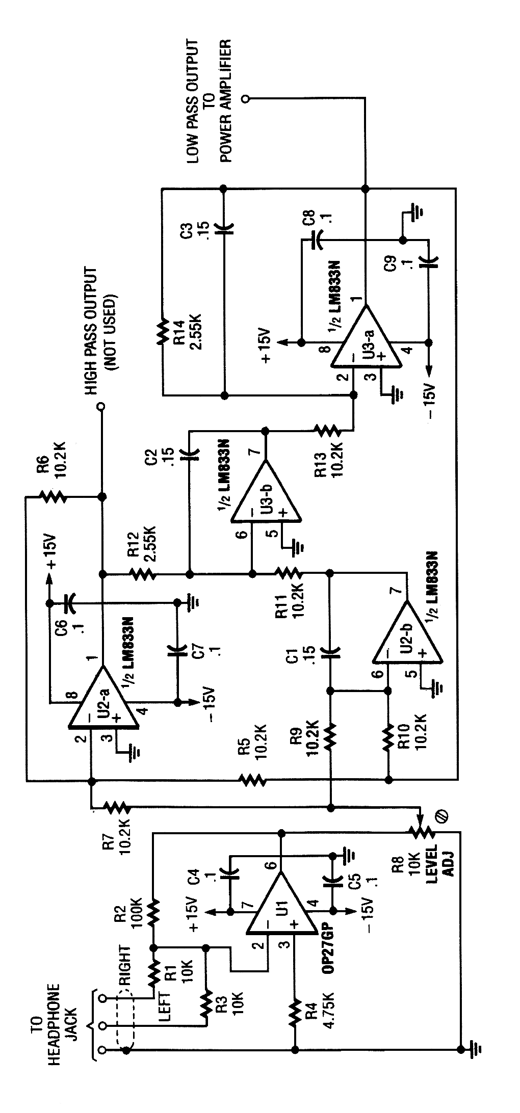 The electronic-crossover circuit contains a summing ampplifier that combines the left that combines the left and right channels from a stereo's headphone jack. Originally used in a subwoofer system, the above circuit might be useful in similar audio applications.