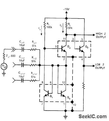 Uses RCA CA3018 four-transistor array as current-mirror triad with low 4 mpedance buffered output, to serve as high-performance summing amplifier. Mea-sured harmonic distortion is less than 170 at voltage gains up to 50 and with output swing of 10V P-P. High output impedance of 51 kil-ohms can be buffered by Q2 connected as emitter-follower.-W.G.Jung. Monolithic-Triad Cument Summer, EDNIEEE Magazine, July 1,1971,p52.