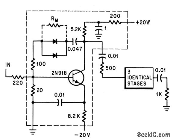 Four-stage i-f using silicon planar epitaxial transistors gives 35 db suppression of second harmonic for input of 0.3 to 30 mV. With one more stage and resistor RM across feedback diode, total phase shift is less than 25 deg.-R. F. Kirkpatrick and R. C. Stouffer, Symmetrical Limiting I-F Reduces Second Harmonic, Electronics, 37:12, p 72-73.