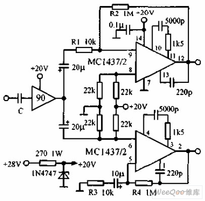 The server preamplifier circuit which uses the parallel op-amp is as shown in the figure, this circuit supplies the differential output to the 115V, 60Hz servo motor power amplifier. One op-amp is reversal-phase connected, another op-amp is in-phase connected to form the complementary output circuit. The voltage gain of this circuit is 40dB, and the single regulator tube supplies the power to this circuit. This circuit uses the depth DC negative feedback, so it has good DC stabilit. The bandwidth is 60KHZ, the input is drived by the 90°shifting phase.